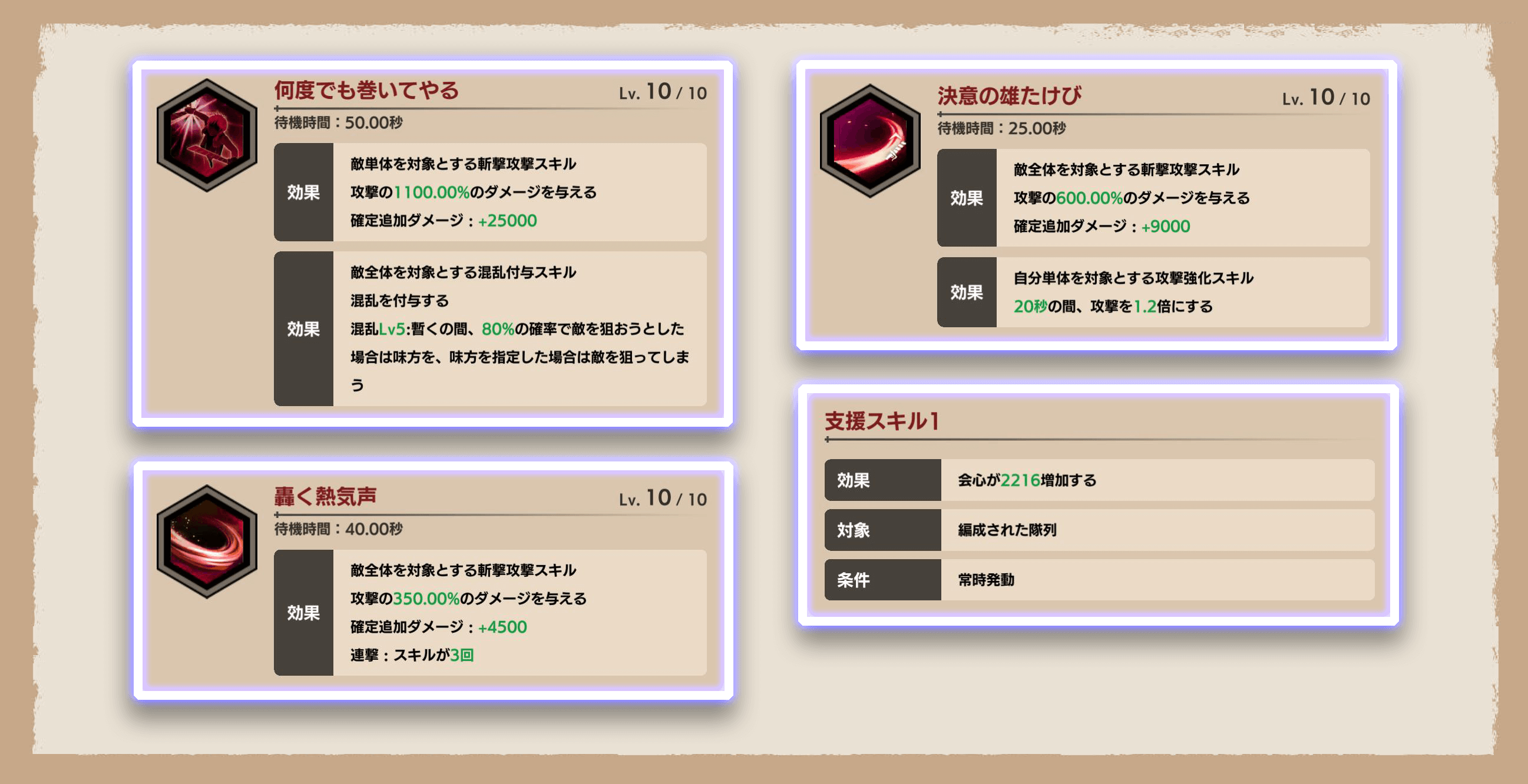 Lv.MAX、熟練度+30、スキルLv.MAX時のものです。