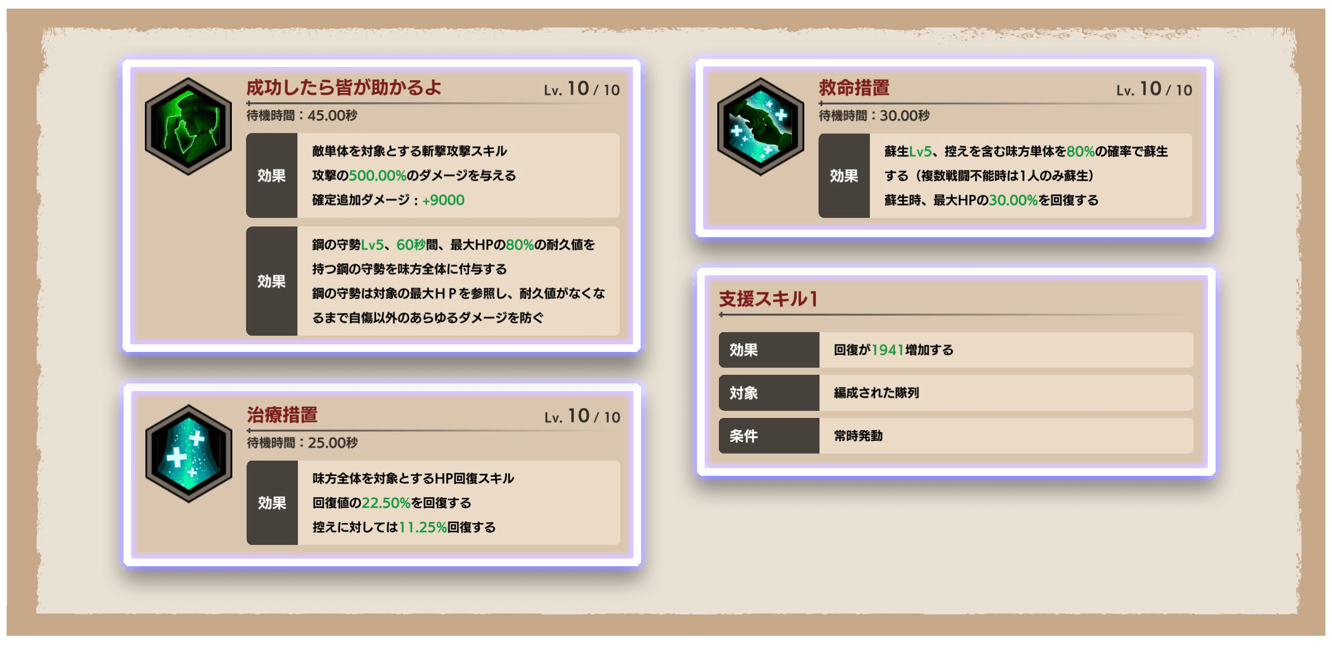 更に60秒の間、味方を護る「鋼の守勢」を発動するスキル「成功したら皆が助かるよ」や、