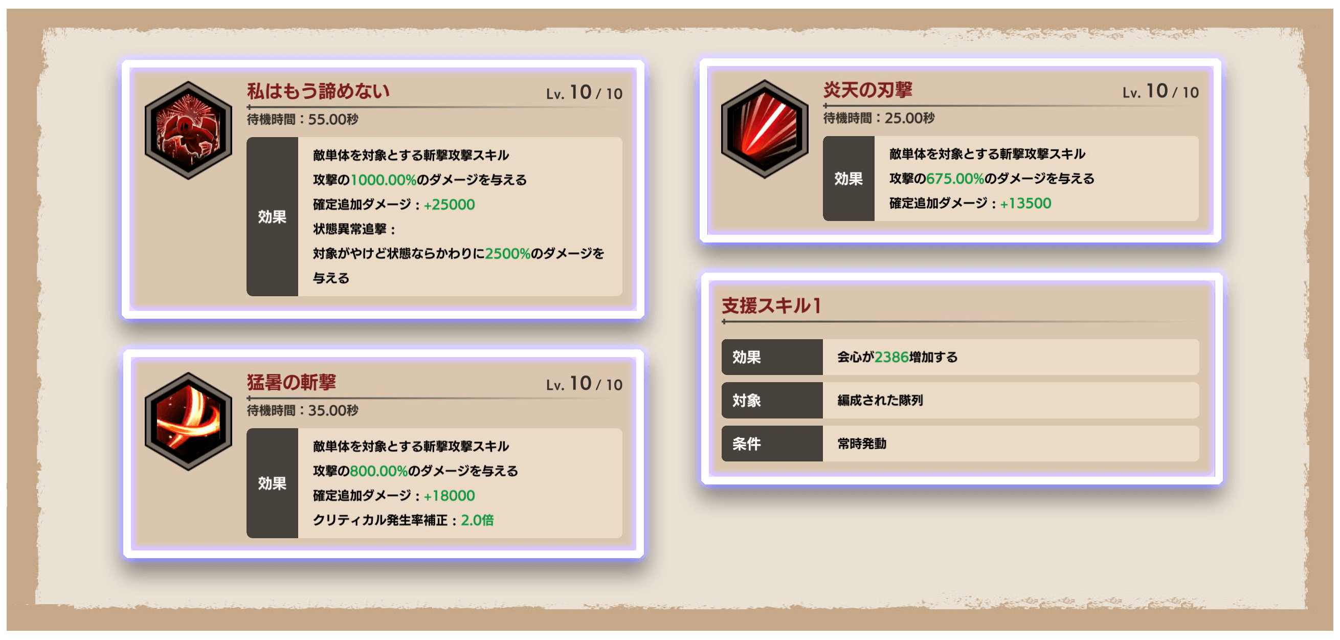 「私はもう諦めない」は高倍率のやけど追撃を持つ技巧スキルなので、