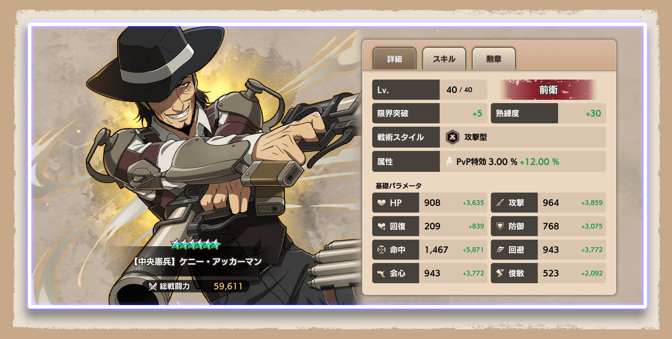 中央憲兵団の名に恥じず対人戦闘の要としてPvP特効で初の金背景で登場したケニー!