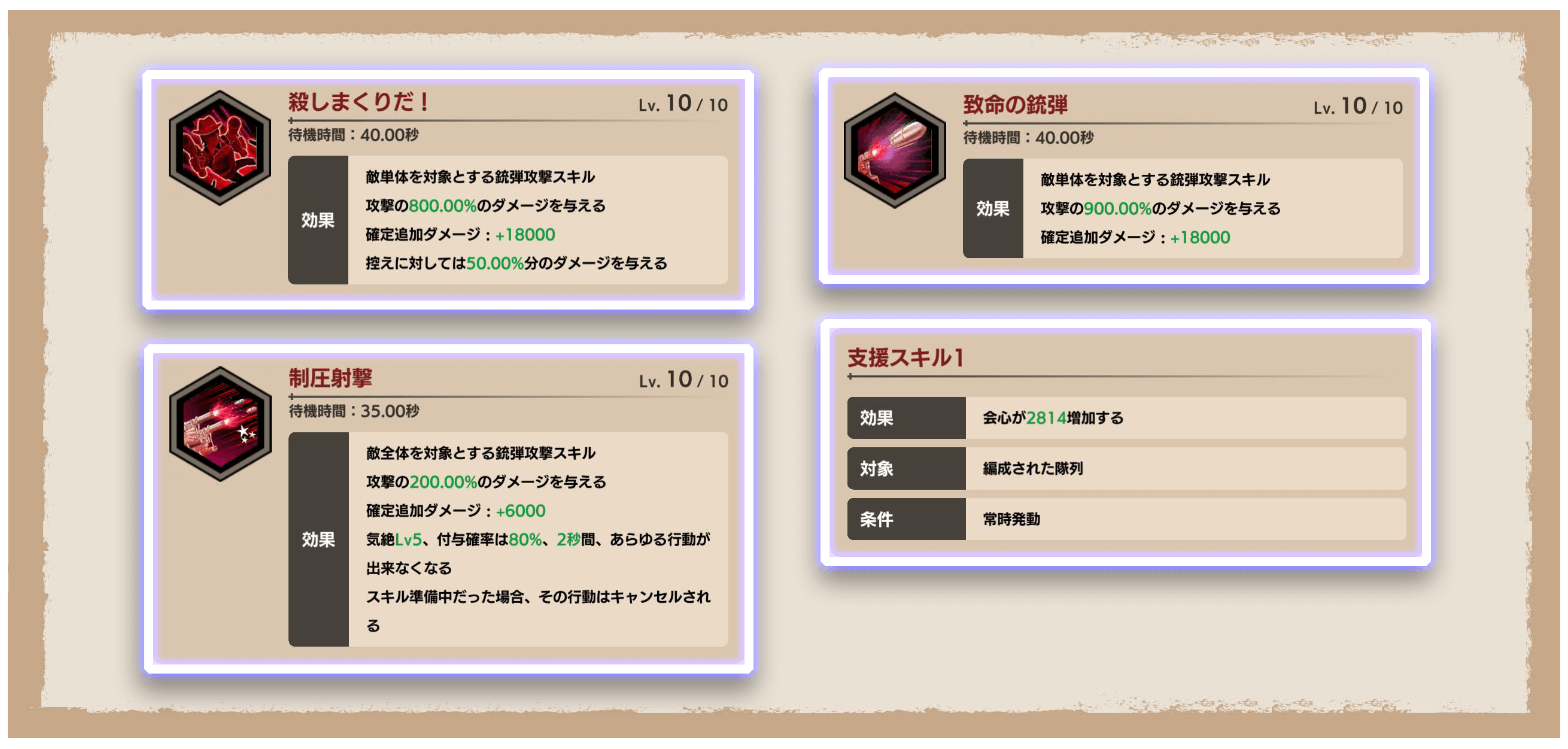 さらに「殺しまくりだ!」は対人戦において相手の控え団員にもダメージを与える強力な技巧スキル!