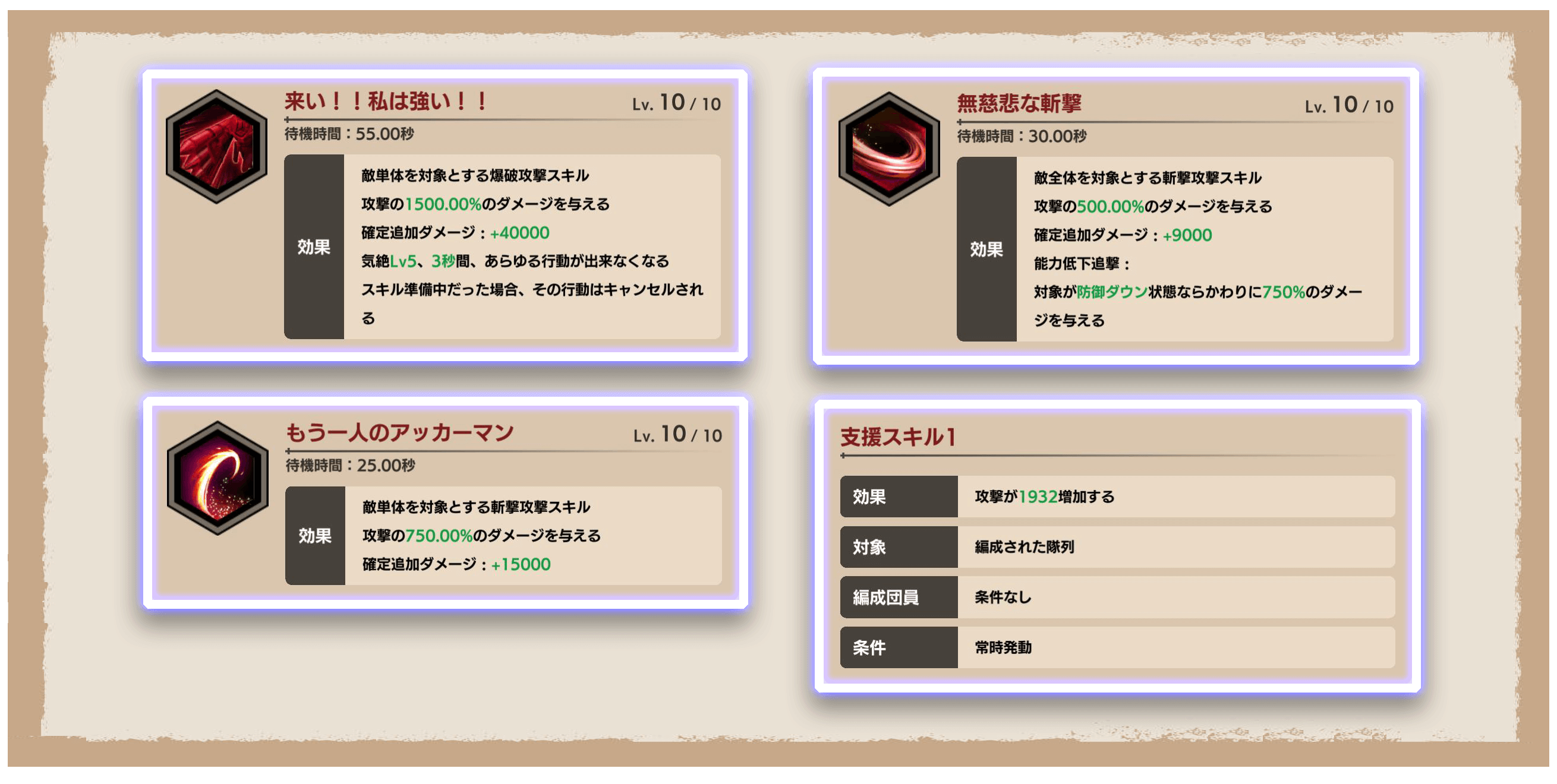 また、短い間隔で発動できる全体攻撃スキルもあるので、様々な場面で活躍が期待できる攻撃型の前衛団員だ!