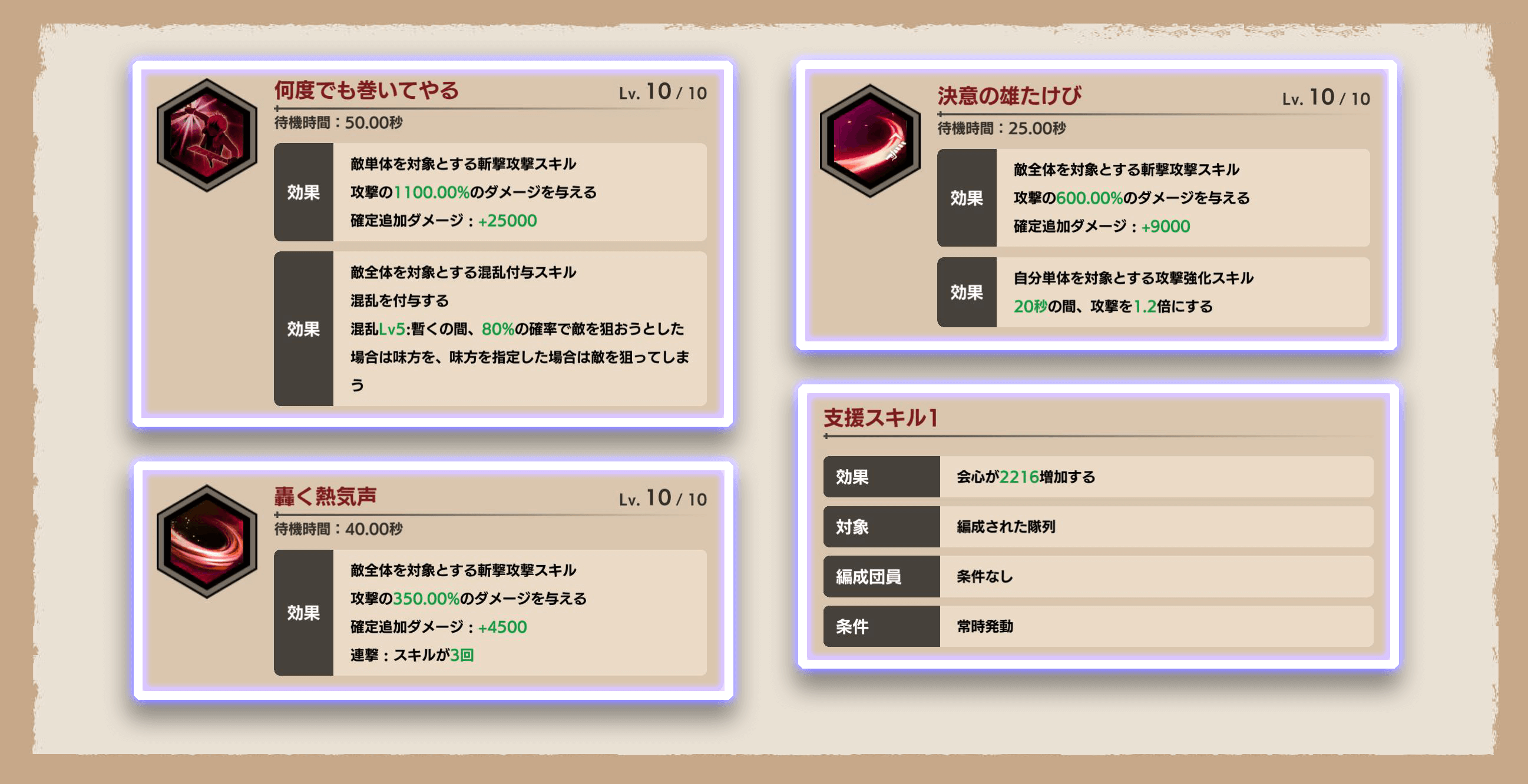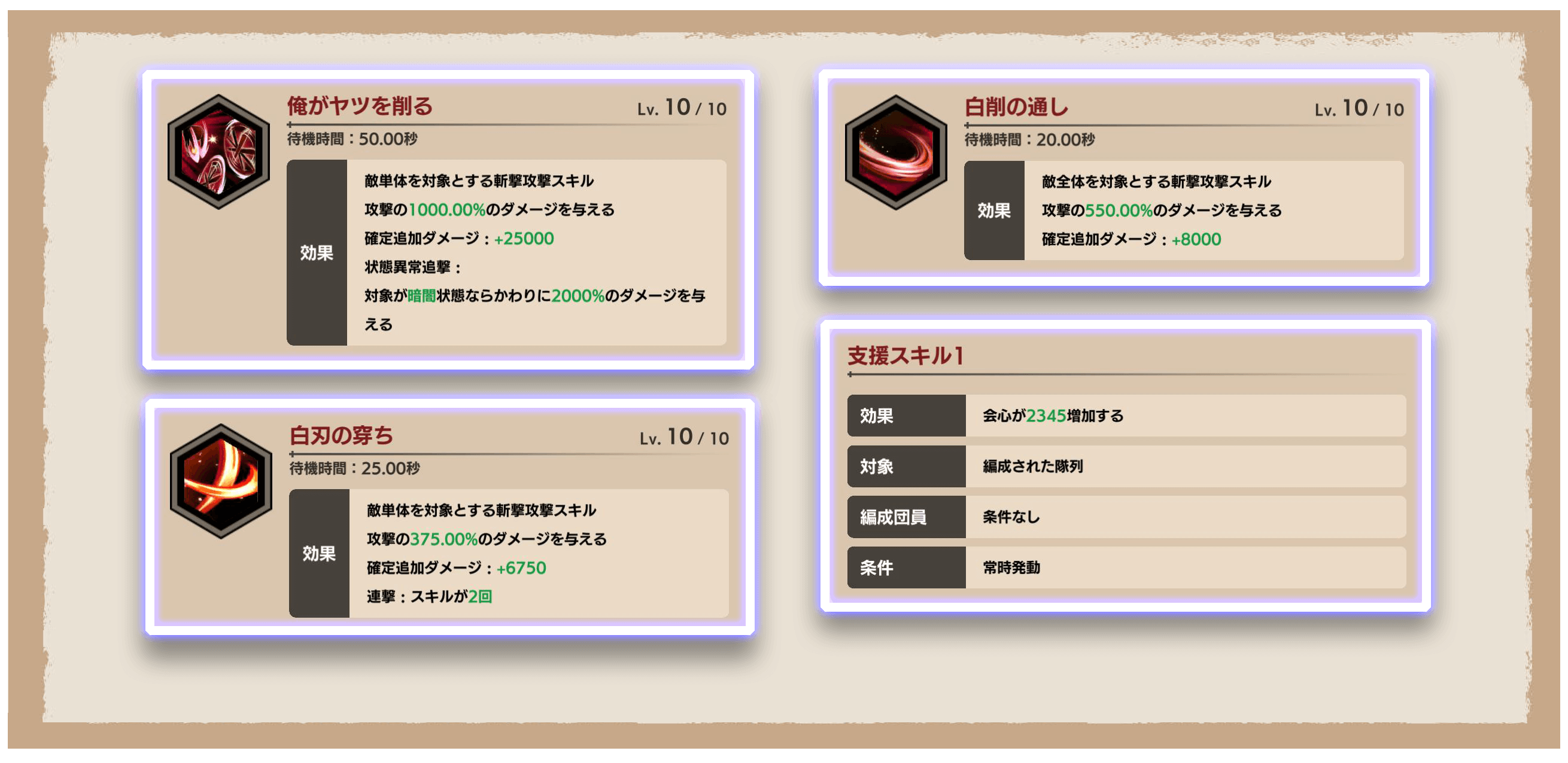 Lv.MAX、熟練度+30、スキルLv.MAX時のものです。