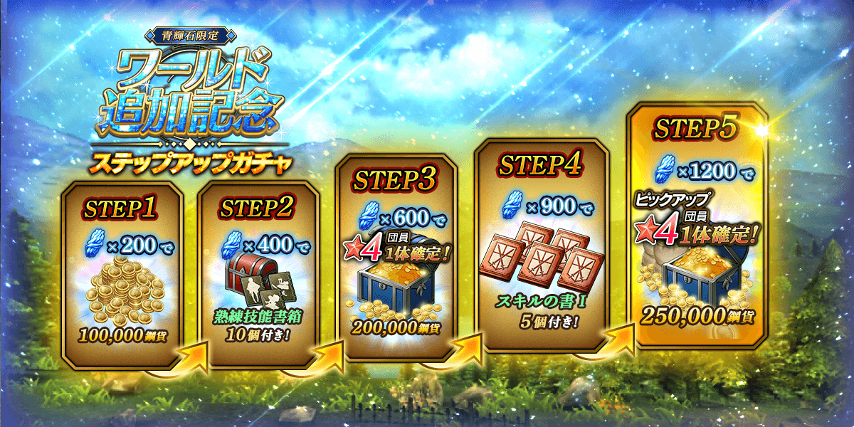 【青輝石限定】ワールド追加記念ステップアップガチャ」と同じ